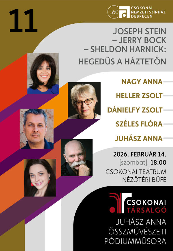 Új lendülettel, friss kérdésekkel folytatódik a Csokonai Társalgó 2026-ban is. A Csokonai Nemzeti Színház Debrecen szervezésében megvalósuló pódiumsorozat február 14-i estje Joseph Stein – Jerry Bock – Sheldon Harnick: _Hegedűs a háztetőn_ című musicaljét és az ahhoz kapcsolódó vallási, kulturális és emberi dilemmákat állítja a középpontba. Az irodalmi esttel egybekötött ráhangoló beszélgetés ezúttal a Csokonai Teátrum Nézőtéri Büféjében várja az érdeklődőket, hogy az irodalom, a zene, a vallás és a színház közös nyelvén vizsgálja a hagyomány, a változás és az alkalmazkodás örök kérdéseit.